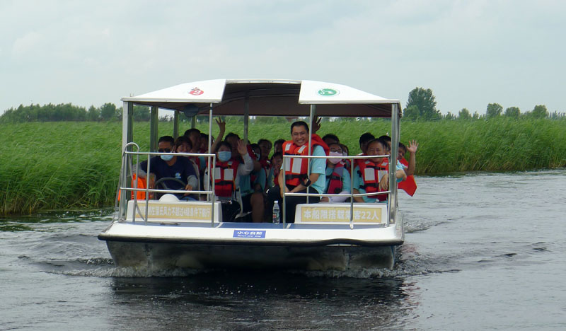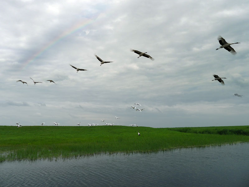翌日,集體來(lái)到黑龍江扎龍國(guó)家級(jí)自然保護(hù)區(qū)觀看丹頂鶴。彩虹與仙鶴齊飛,湖水共長(zhǎng)天一色。大家眼睛望著飛舞的丹頂鶴,心里想著的卻是鐵鍋燉大鵝。